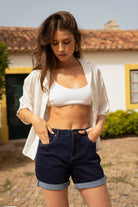 Raw denim shorts, ideal for a casual summer look. Perfect for pairing with a basic top or a flowing shirt. Their slightly fitted, straight cut offers a flattering, modern silhouette.
