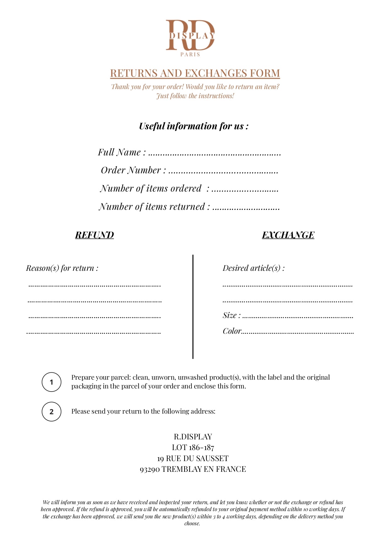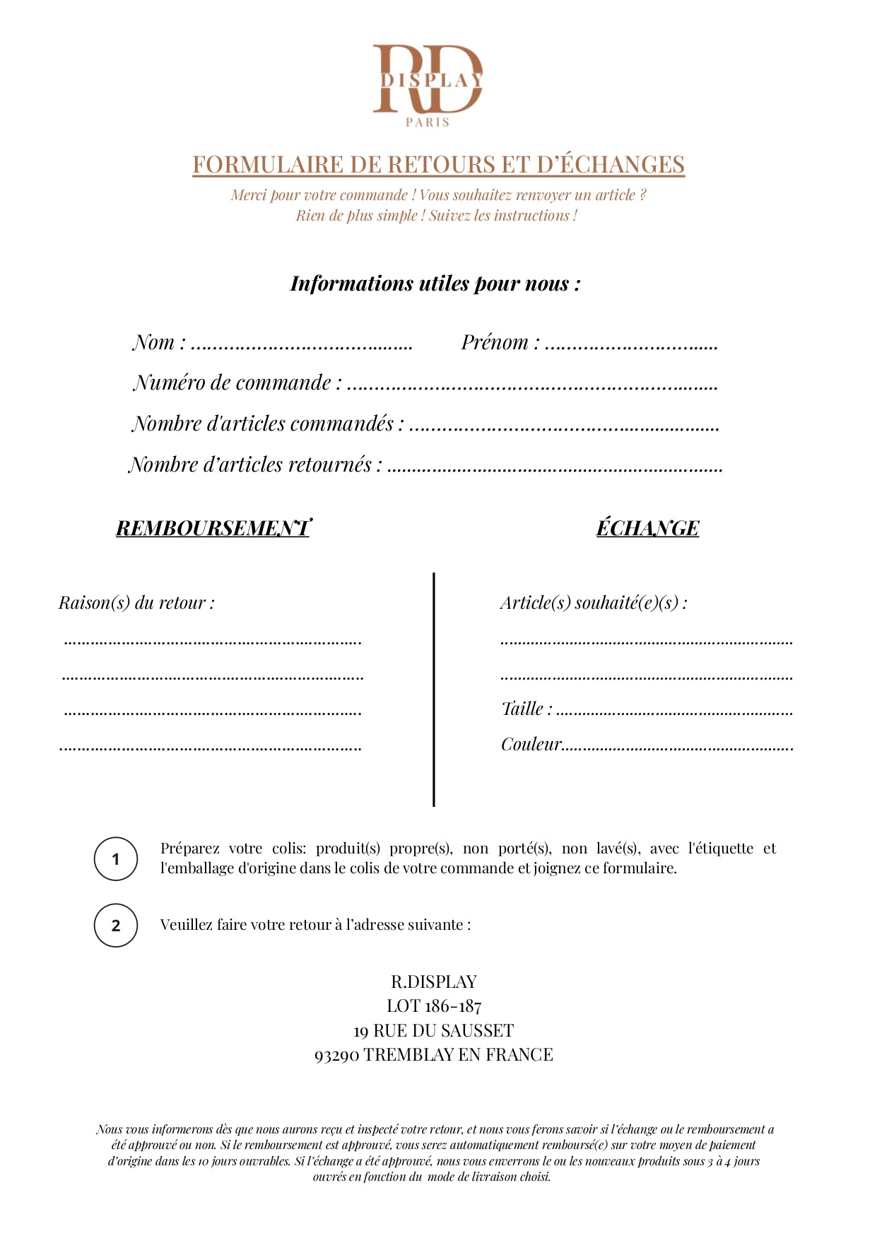 Enfin, envoyez votre colis : nous traiterons le retour ou l’échange dès réception, sous réserve que toutes les conditions soient respectées.